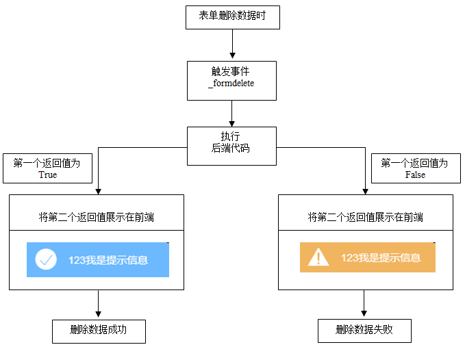 | 前置返回 | False:拦截删除操作 | 前端展示文本信息,为空无提示 |