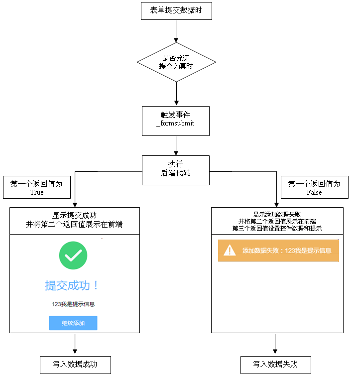 | 前置返回 | False:拦截提交操作 | 前端展示文本信息,为空提示“提交成功” | 根据json字符串,修改前端表单字段赋值与属性 |