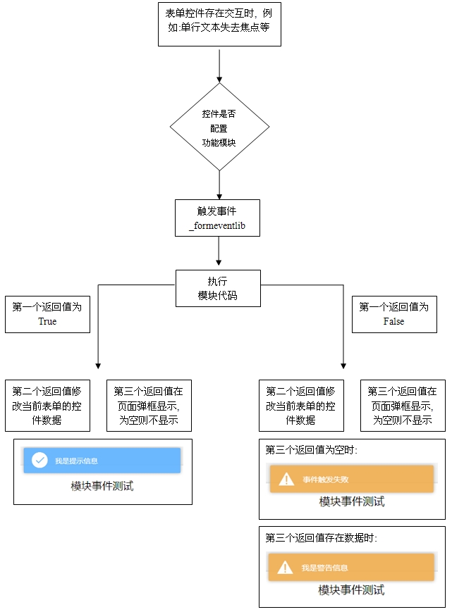 『表单控件触发事件』入口函数,启用后对表单控件操作时触发(例如“单行文本”失去焦点,“下拉框”选择一个选项时),可以修改或设置当前表单字段值与属性。