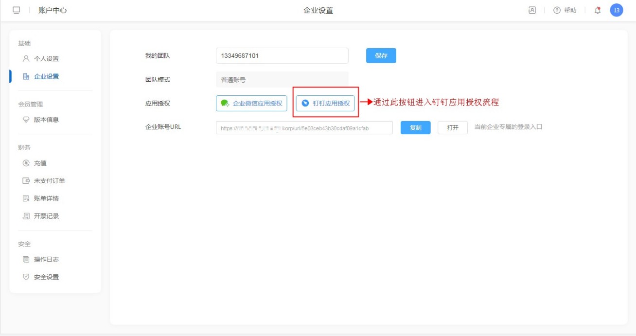 用户通过百数账号登录系统后,进入【右侧头像】-【账号中心】-【企业设置】,在企业设置中可以进行钉钉应用授权。