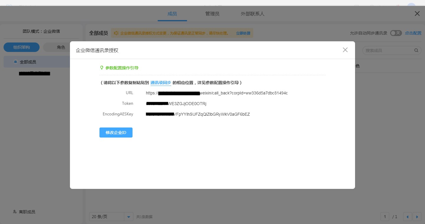 2. 在企业微信后台批量将成员由不可见部门设置为可见部门时,自动同步通讯录后,可能会超过系统成员数量限制,导致系统功能无法使用,此时需手动移除多余数量的成员。