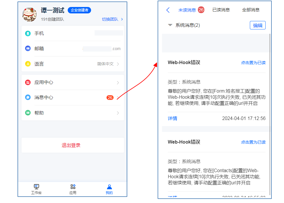 移动端的个人中心[即:我的]内可对当前账号进行管理,并可进行应用的安装和管理。