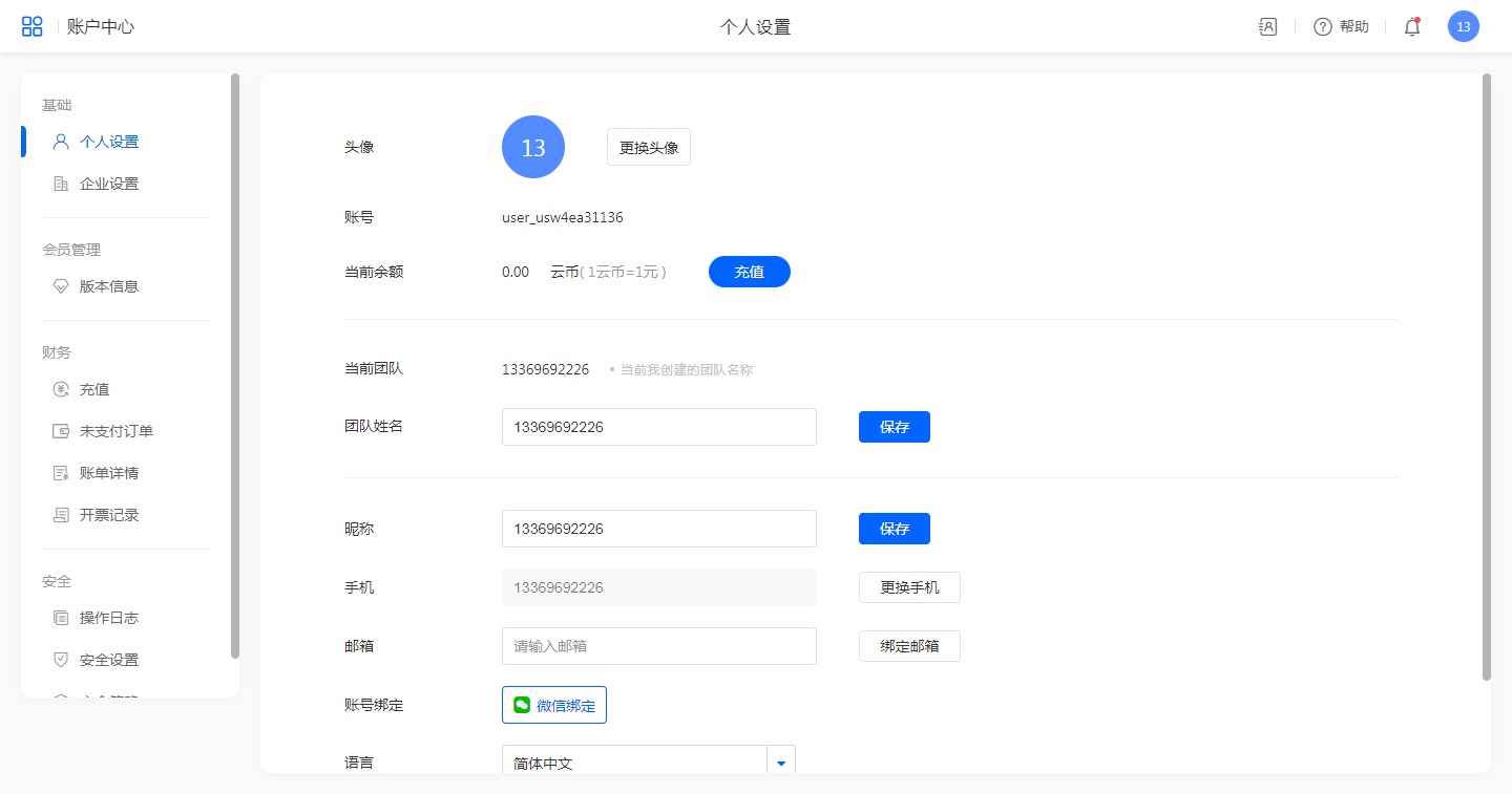个人设置中展示了当前账号的基本信息,包含:头像(可修改)、账号、当前余额、当前团队、团队姓名(可修改)、昵称(可修改)、手机(可修改)、邮箱(可修改)、账号绑定(绑定微信)、语言(支持英文、简体中文、繁体中文切换)