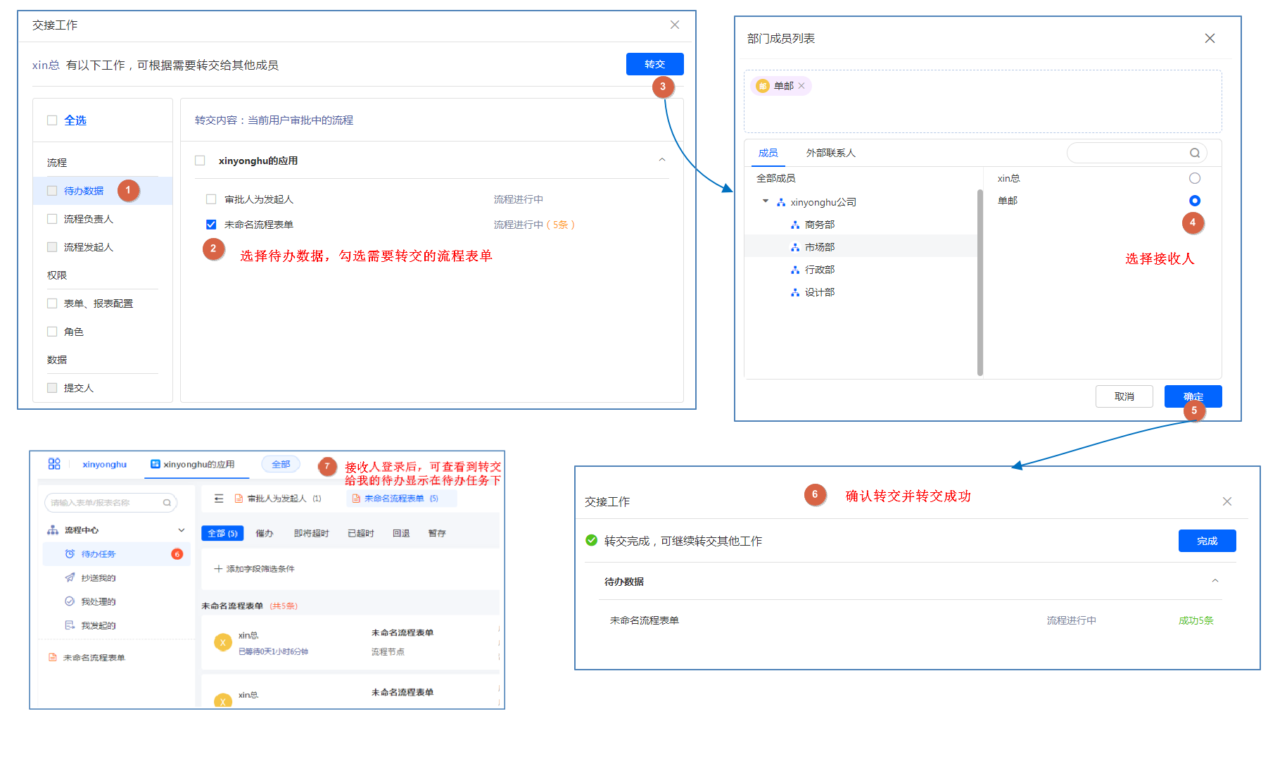 包含节点负责人、节点抄送人、限时处理被提醒人、转交候选人。转交给接收人后,新提交流程的相关负责人数据会流转到接收人处。