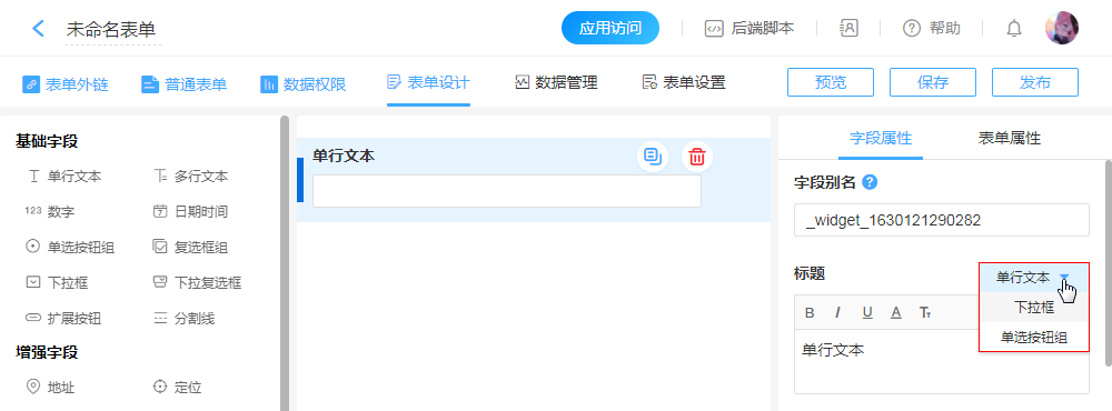 “字段别名”用于后端开发,默认为系统自动生成的随机字符串,可修改。