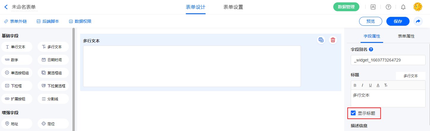 “多行文本”用于表单中录入多行数据的场景,可以填写多行文本,支持换行填写。