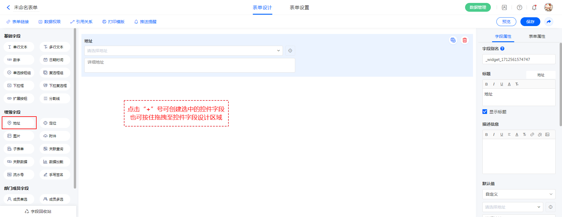 “地址”字段专门用来填写地址格式信息,其中“省、市、区”可以直接选择,无需手动填写,能够有效提高地址信息录入效率。