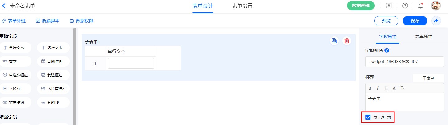 注意:关联数据、关联查询、附件、图片、手写签名,多行文本 不支持做为子表单数据标题。