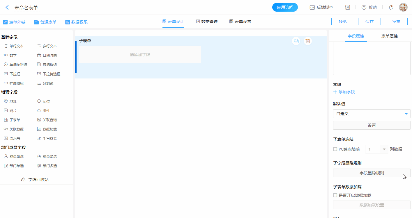 - 格式固定:指根据实际需求设计添加好的子表单字段。