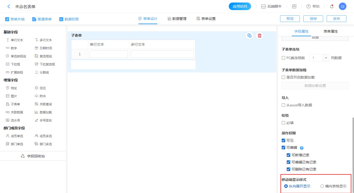 影响PC端,可以设置冻结子表单的前几列数据,当子表单字段过多时方便访问。