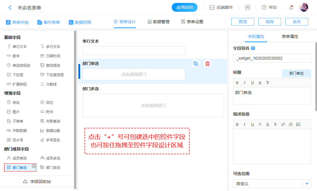 | 本表中的部门字段设置可选范围,操作如下图 |