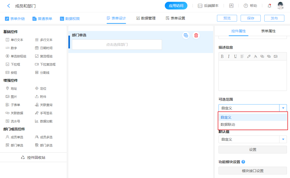 - 部门字段的可选范围:自定义、数据联动