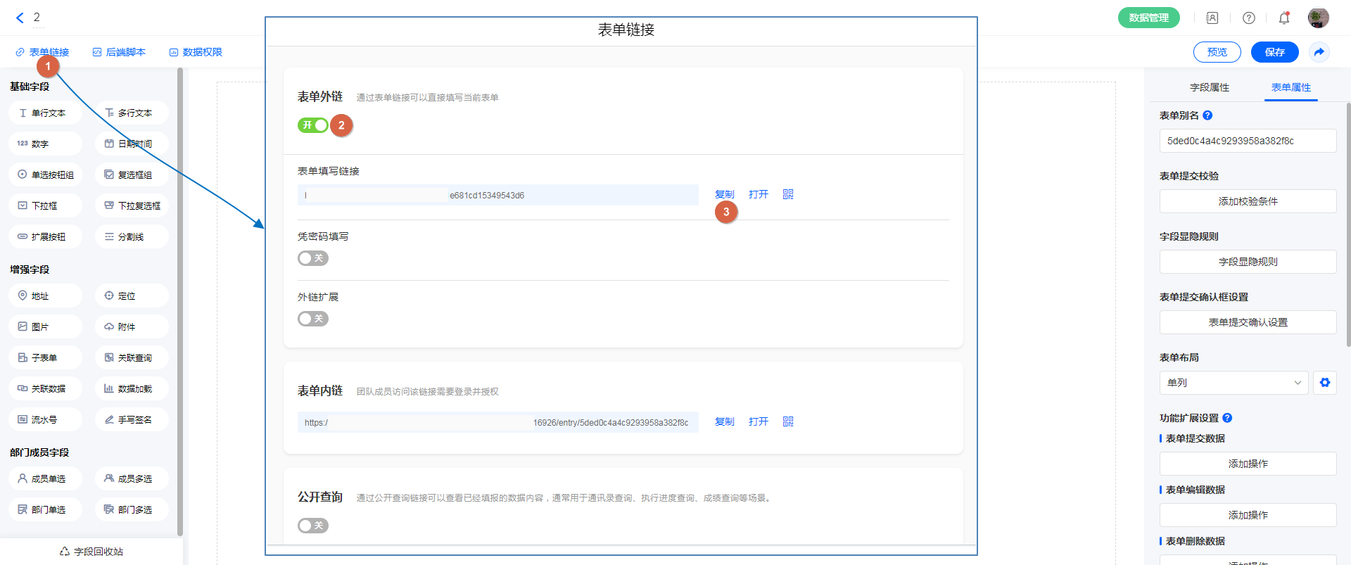 操作步骤:表单编辑页面 > 表单链接 > 开启“表单外链”开关