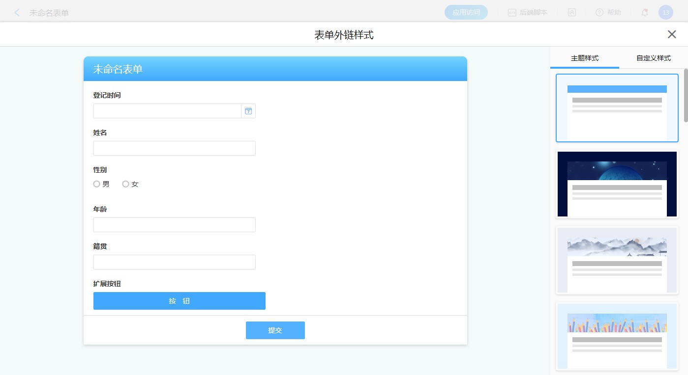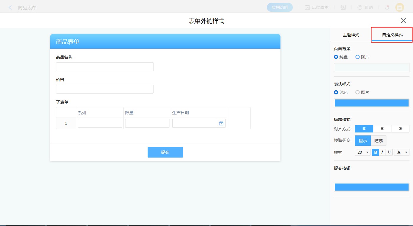 自定义样式可以自行设置页面背景、表头样式、标题样式以及提交按钮的颜色。