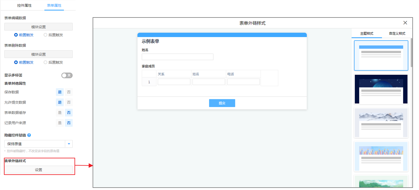 表单外链的样式分为主题样式和自定义样式,主题样式即百数内置的样式模板我们选择就可使用。自定义样式即由自己自定义设置。