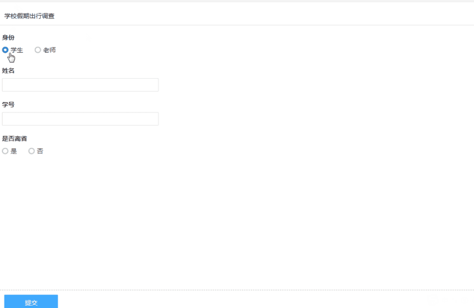 | 当「身份」 等于任意一个 学生、老师 时 | 显示「姓名」「是否离省」 |