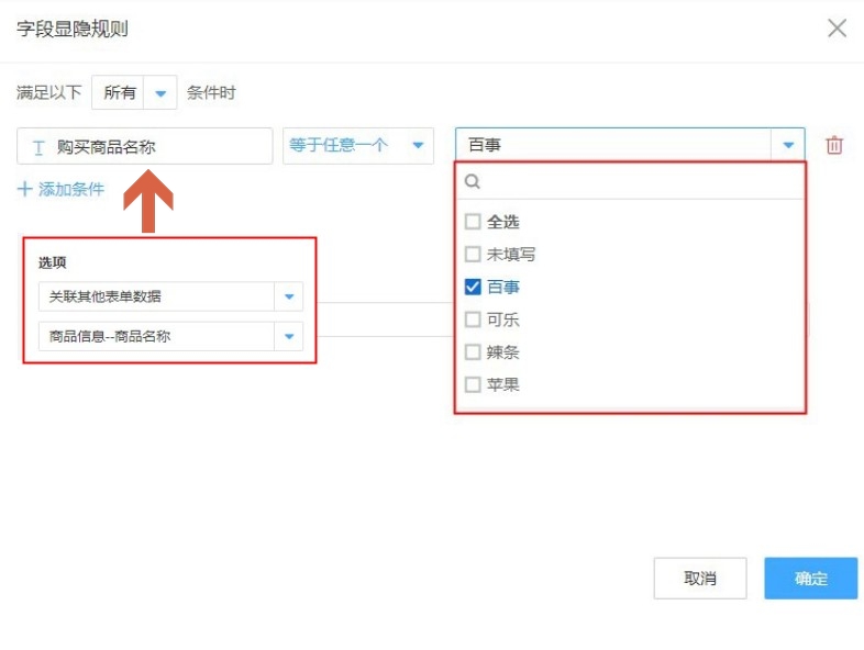 如下图中,【购买商品名称】字段关联【商品信息】表 的【商品名称】字段,在设置显隐规则时,可以直接联动出【商品信息】表中的数据进行条件设置。