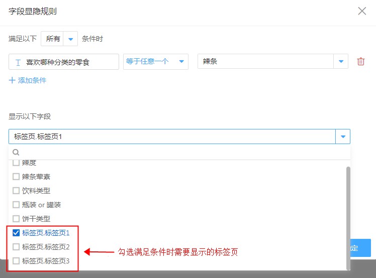 设置方法:在设置显隐规则面板,显示字段中勾选满足条件时需要显示的标签页。