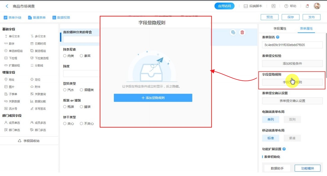 - 普通字段:表单设计-表单属性-字段显隐规则