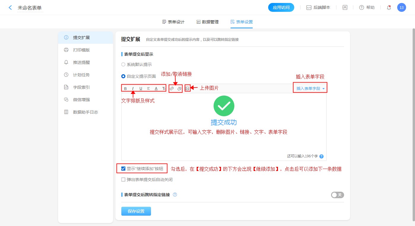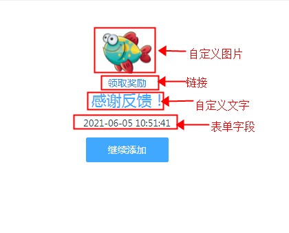 我们可以在表单提交后在提示页面添加链接用于跳转至另一表单或通过链接快速进入其他说明处。