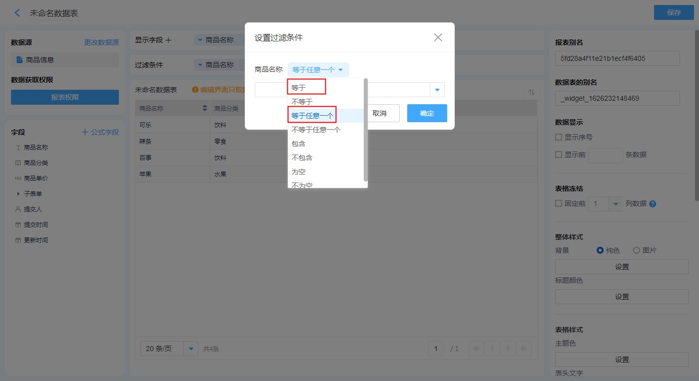 步骤:【报表】——【报表编辑】——【添加数据源并设置字段】——【过滤条件】;