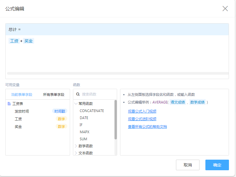公式面板下方可以选择公式所要用到的字段。一定要从下方选择字段(蓝底),手写或者复制无效。除了MAPX函数之外,其他函数的字段都必须来自当前表单字段。