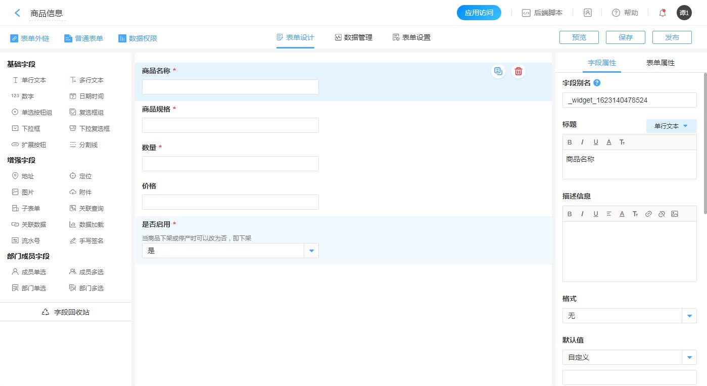 【商品信息】:商品类型、商品名称、商品规格、价格、是否启用,5个字段。