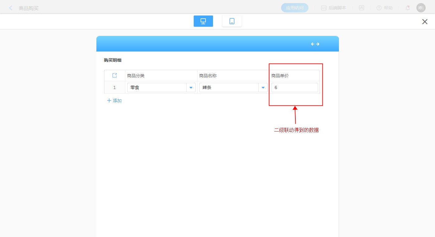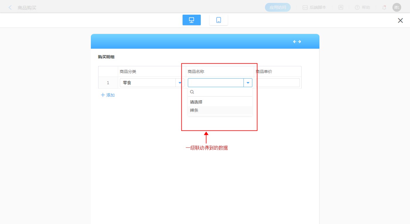 3、一级联动:【子表单】控件属性“字段”添加1个【下拉框】字段,标题为:商品名称,数据联动到表单【商品信息】里的"商品名称"。