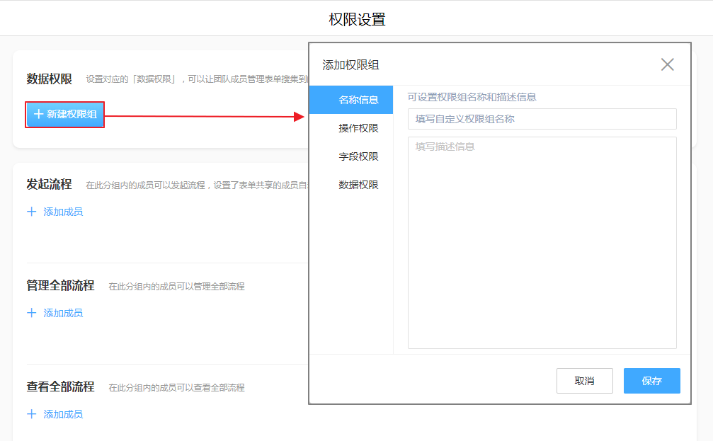 即给该权限组命名(权限组名称为必填)并可对该权限组进行简单描述(描述信息为选填) -