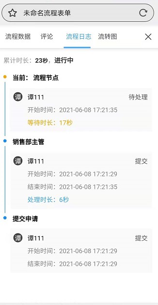 - 流程日志:,显示了各个节点负责人的处理情况,包括负责人,操作状态,开始时间,操作时间。