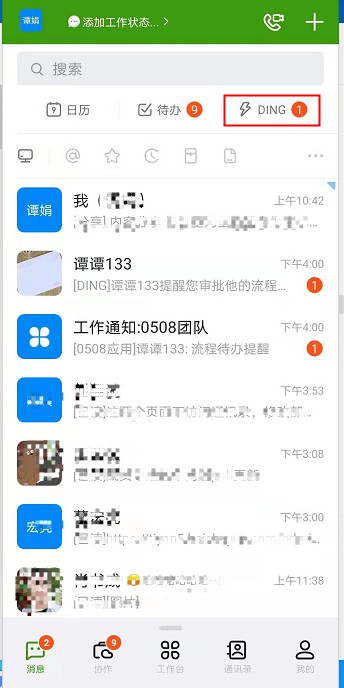 流程节点负责人收到催办后,有 DING消息,并在我的待办下,发现流程有催办标识。。