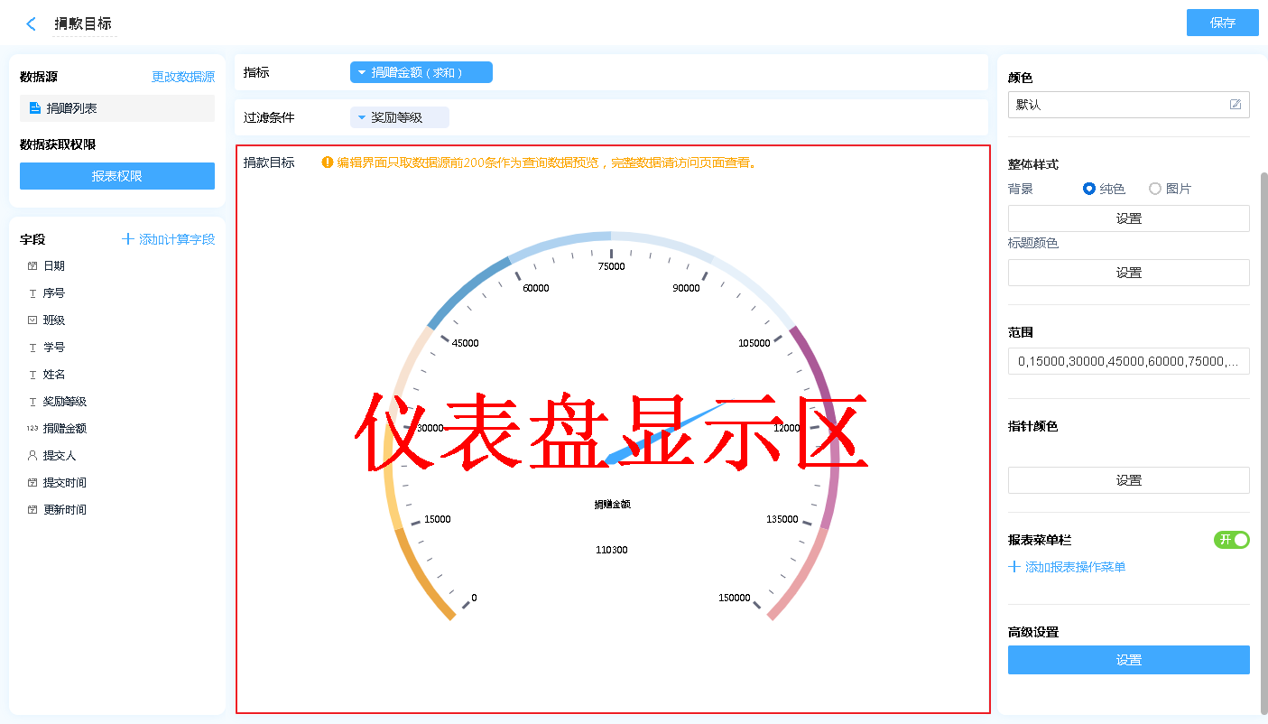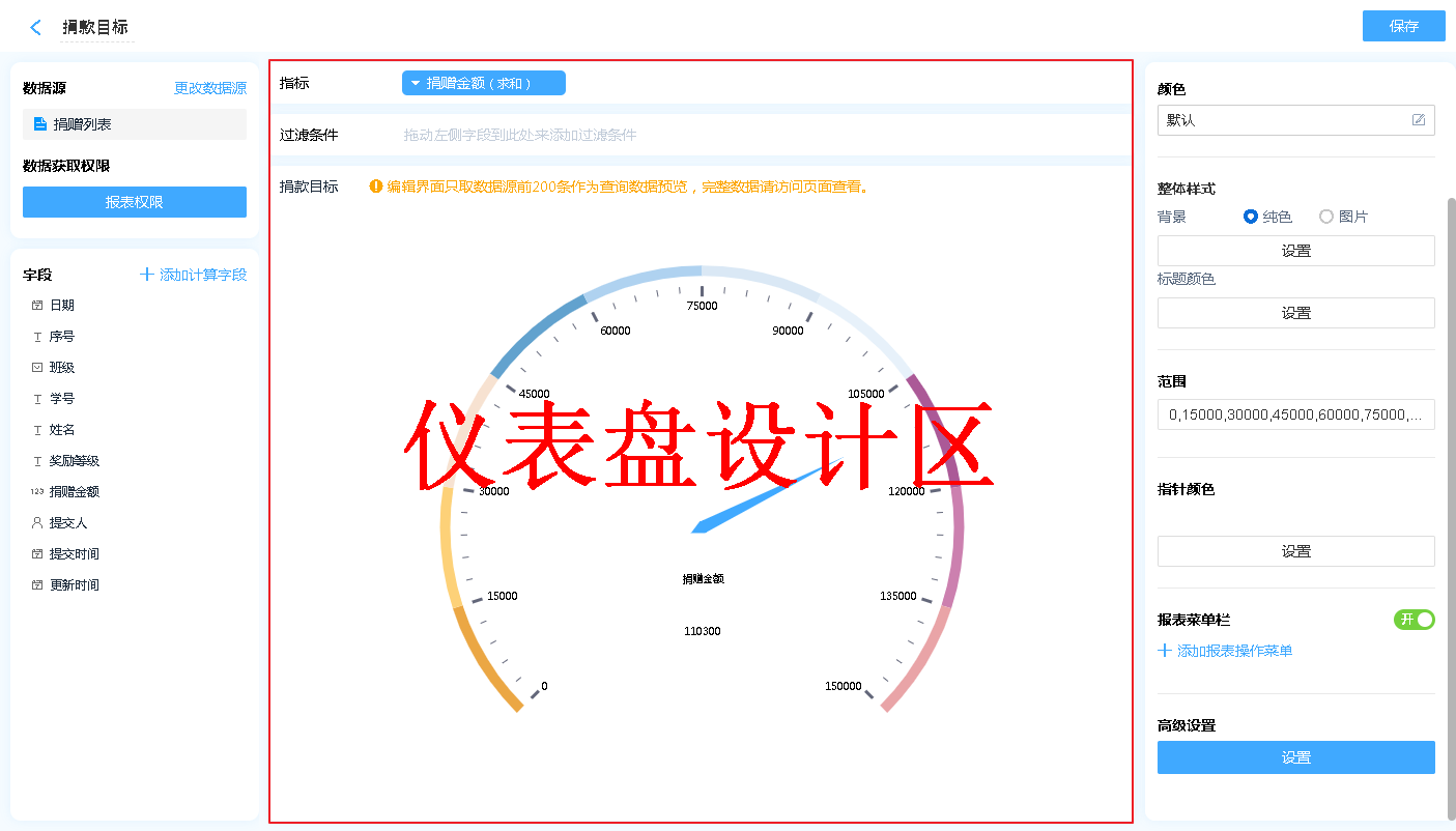 仪表盘支持样式自定义,可自定义的包括:样式、颜色