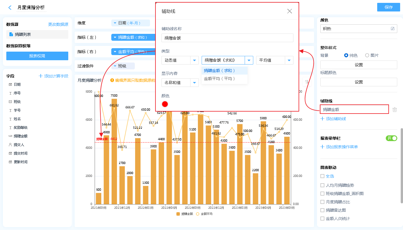 如:分数、身高、成绩、捐赠金额等场景,可以设置其平均值作为参考线,从而得出哪个班级的对应的值超出平均值,哪些班级低于平均值。