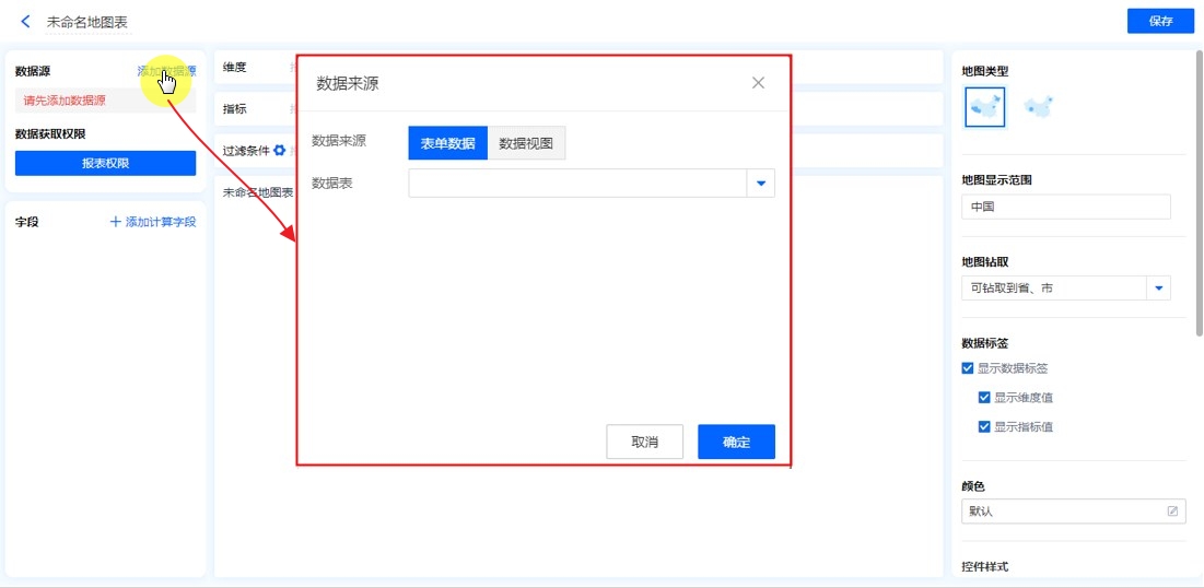 数据源就是指当前地图表的数据来源,可以是表单、数据视图。