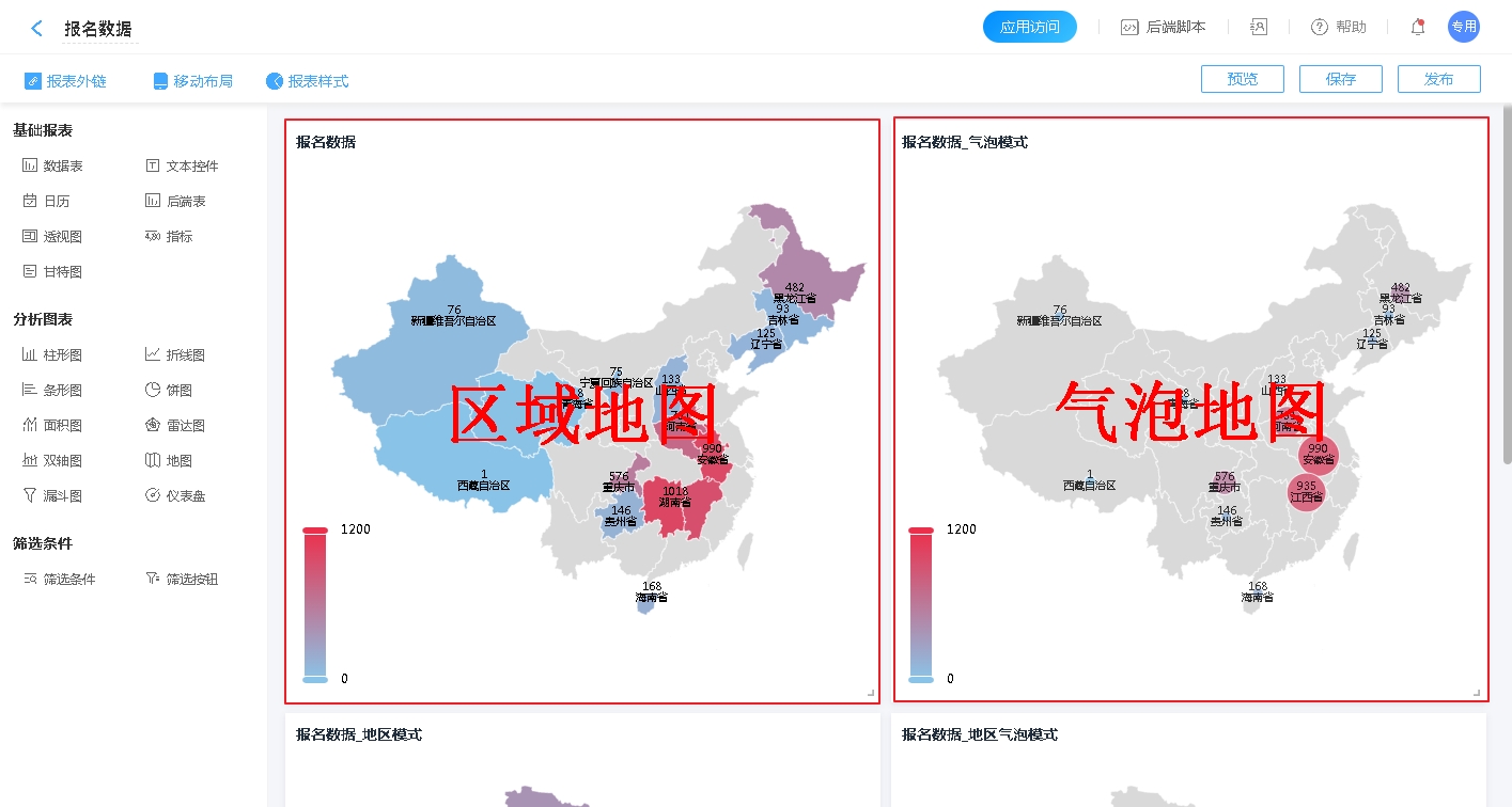 地图报表主要用来统计不同区域的数据,进行数据分享;