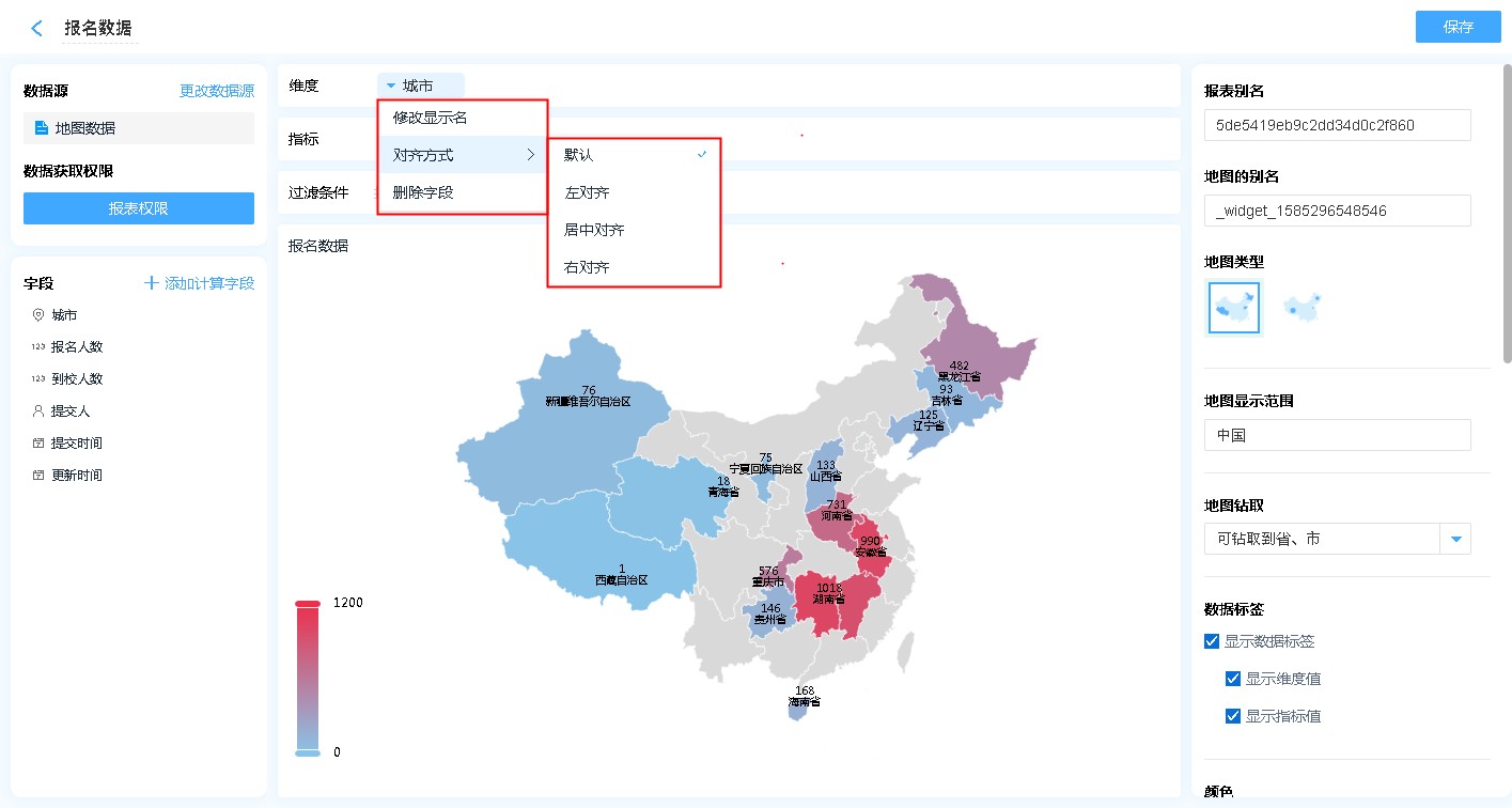 显示名称: 字段添加进入显示字段区域后,可自行修改其在地图中的表头文字对齐方式:支持报表的排列方式删除字段:此处的删除字段,是指从显示字段中删除,删除后仍可重新添加,不会对原表造成任何影响。