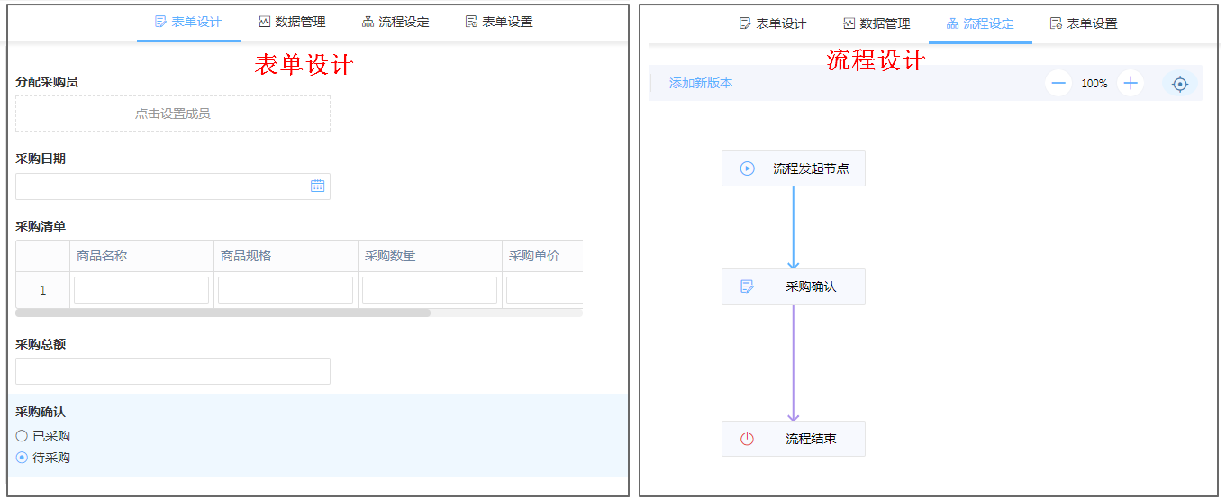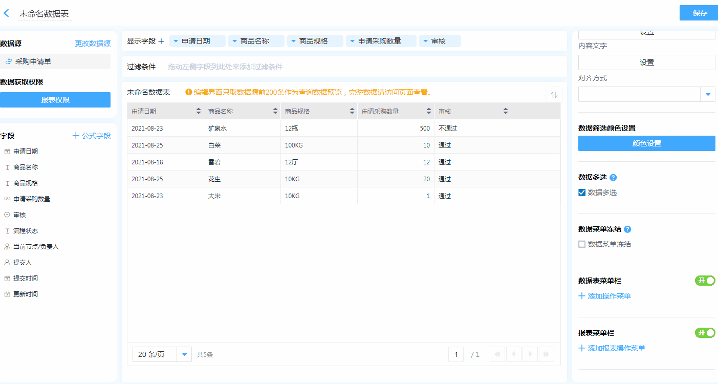 本章主要以采购为例,员工提交采购申请,领导可在报表查看具体的申请明细,并可选择多条采购申请数据分配给相应的人进行采购,申请明细会写入采购清单的子表单中。