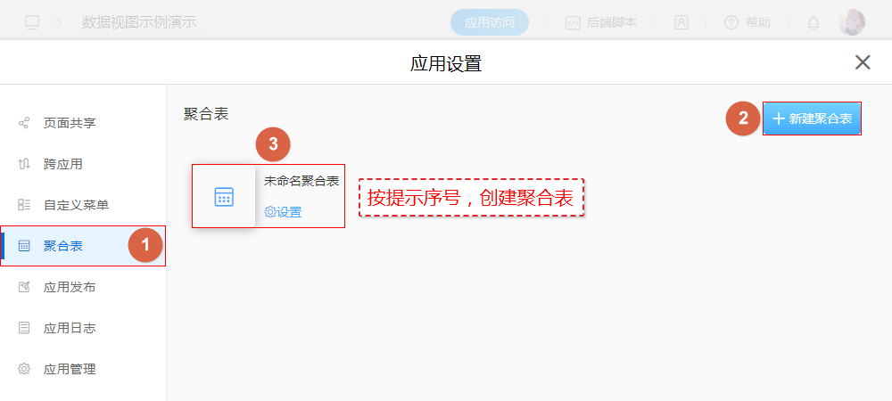 | 应用管理(进入应用设计页面) > 设置 > 聚合表 |