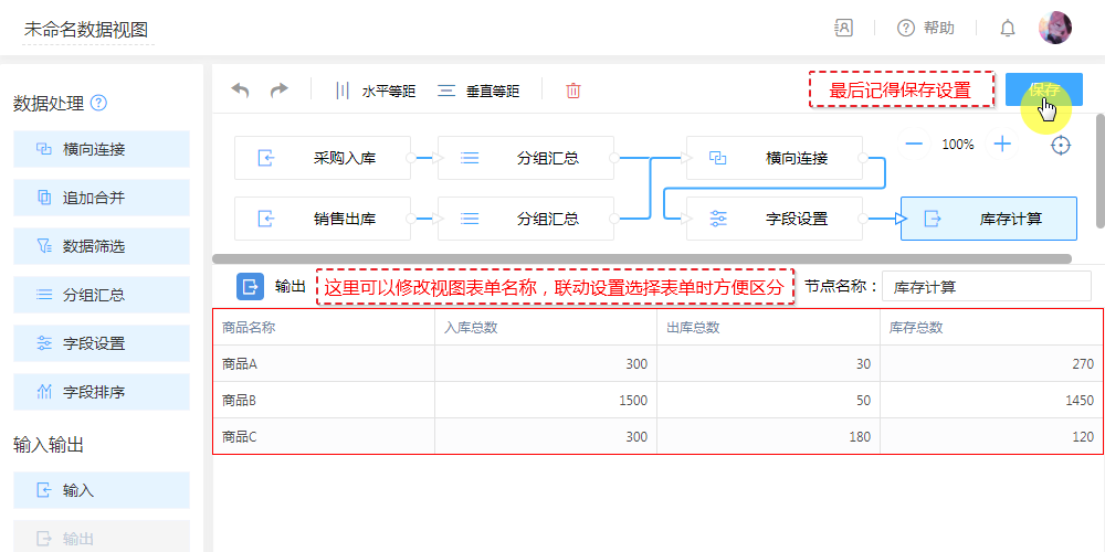- 配置:分组汇总,对出入数据按“商品”相同的进行汇总出入“总数”。