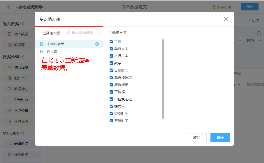 配置指定表单“历史数据”传入数据助手处理。