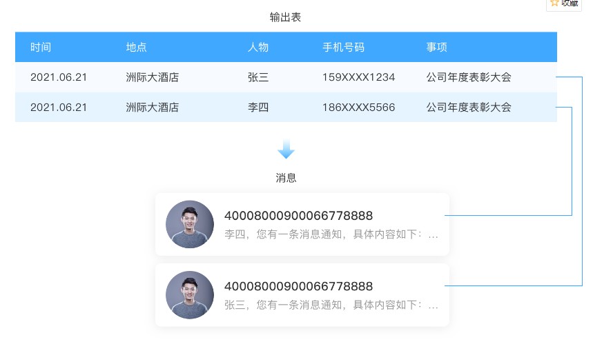 将输出表内的所有数据进行以短信/邮件/语音通知/微信提醒的方式发送给指定的成员或部门或手机号或邮箱。