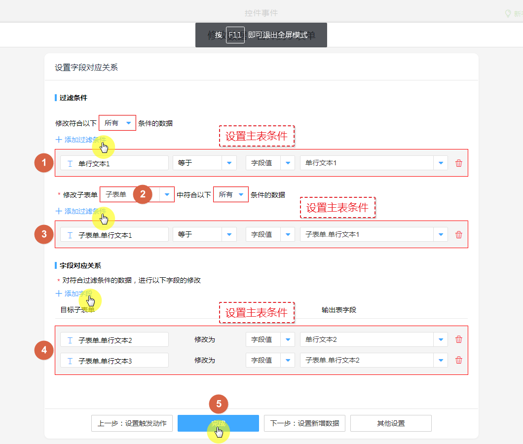 ④、设置子表单更新字段。