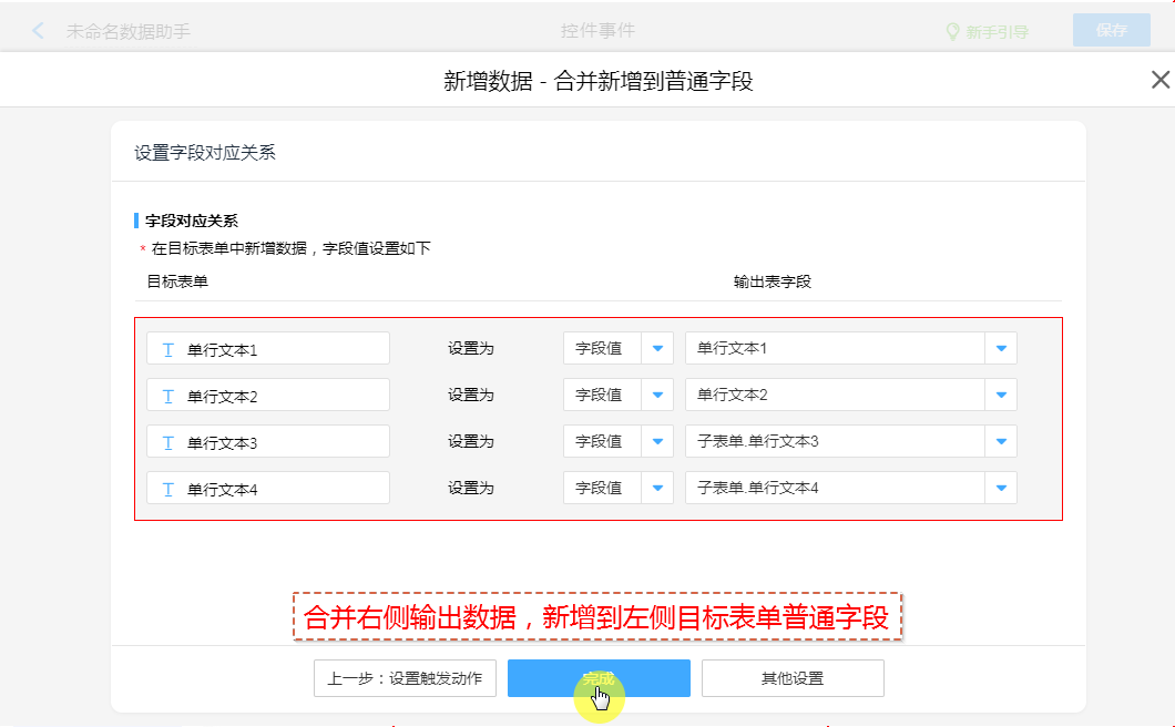 创建“新增数据”动作节点,将“输出表”的数据新增至其他表单。