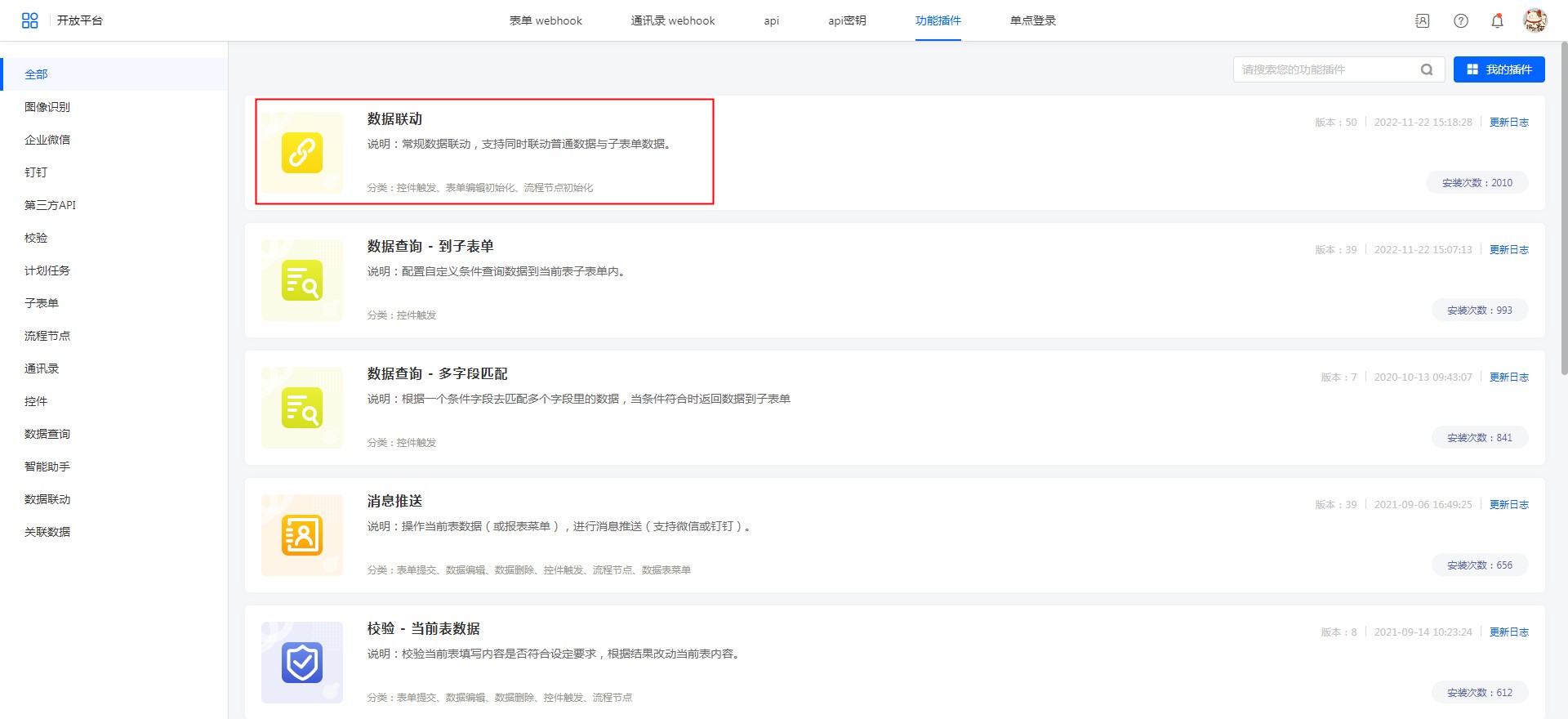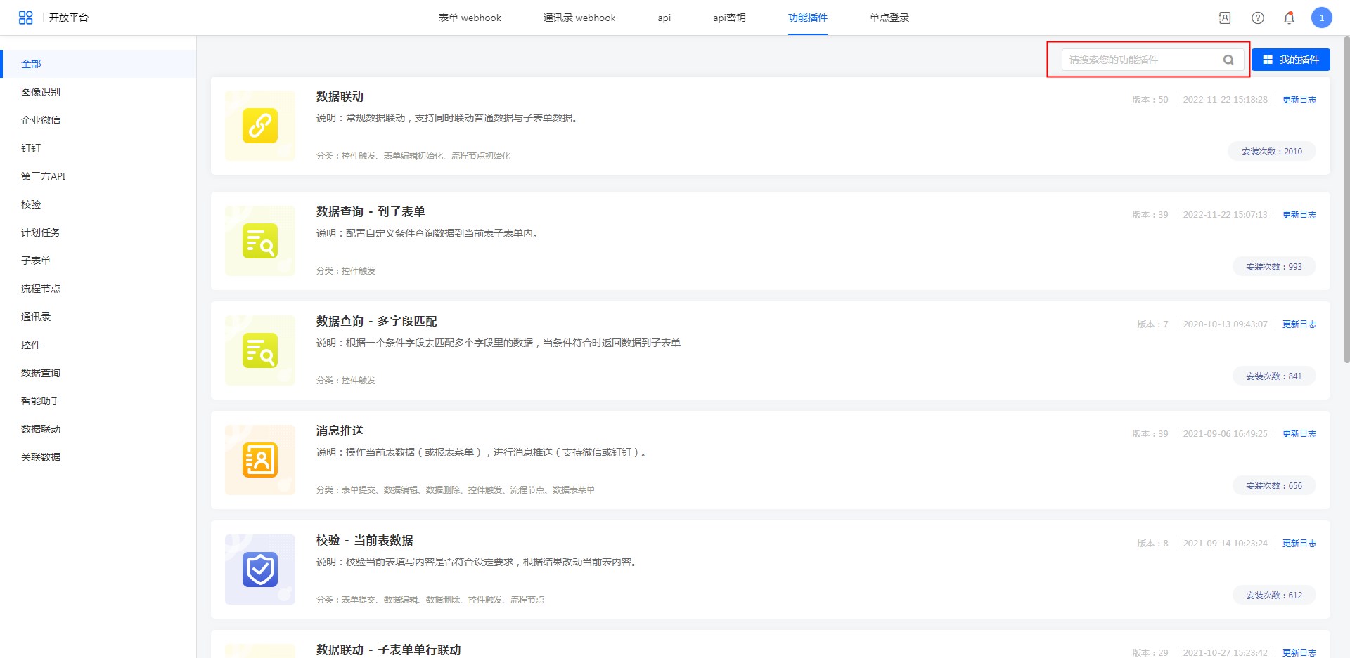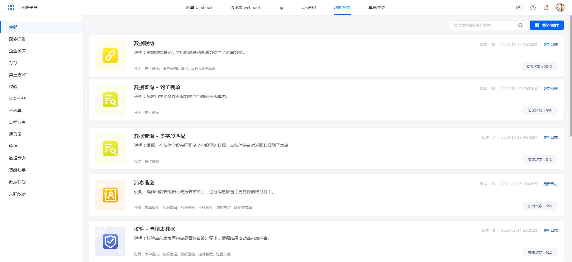 功能插件的初衷即可通过可视化的配置后能实现表单系统所做不到的功能,功能插件的功能可以灵活多变,但是其使用难度与表单一致,意在可对表单功能进行无限扩展的同时降低使用难度。